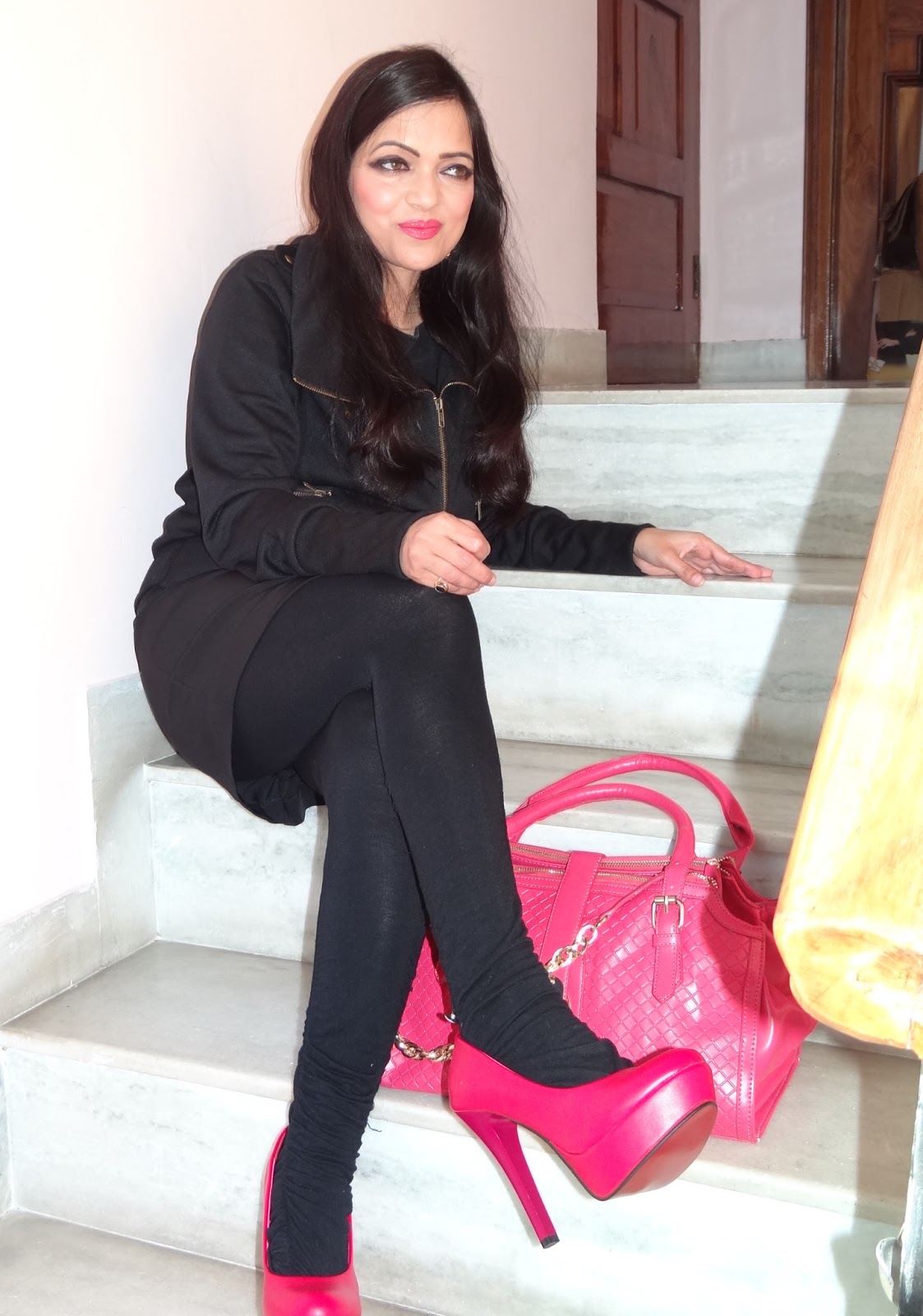 Black is always my favorite color for any special day so I wore my favorite black skirt with black jacket with gold detailing. I wanted to make this look a bit special so I gave this black outfit a kiss of hot pink. Deep pink in between pink and fuchsia, so I took my favorite pink bag and pink heels and finished this look with touch of pink and smokey makeup.